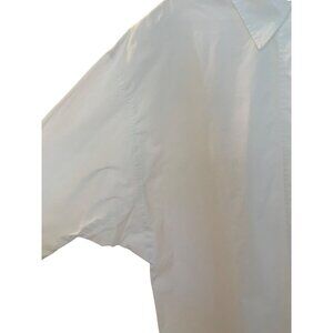 Elegant and versatile St John women's button-down crisp white cotton shirt featuring signature buttons. Perfect for a chic, oversized look. This stylish piece is ideal for various occasions and can be dressed up or down for a comfortable yet sophisticated
