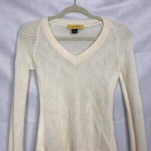 EUC. Cream color open knit fitted sweater. V-neck line. Long sleeves. St. John charm. Wool Blend.