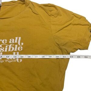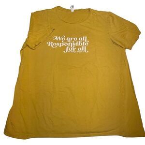 Features and details: light to medium weight, marigold color, "We are responsible for all" quote on front in white