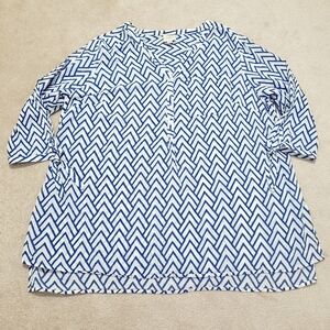St. John’s Bay lightweight tunic blouse in size 1X. Features a blue and white chevron print, split neckline with partial button front, and 3/4 sleeves with tie accents. 100% cotton—soft, breathable, and perfect for spring or summer. Excellent pre-owned condition.