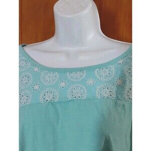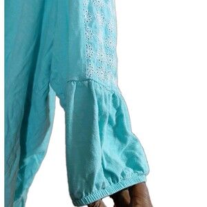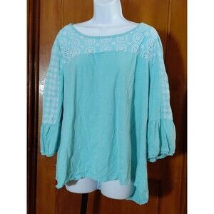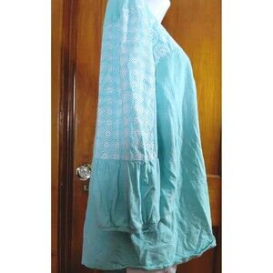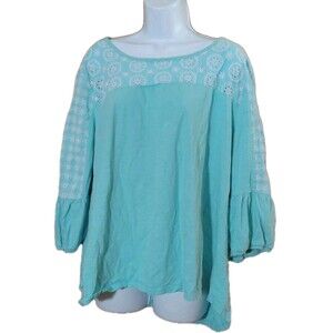 St John's Bay 3X Turquoise Round Neck Embroidered Puff Sleeve Cotton Top