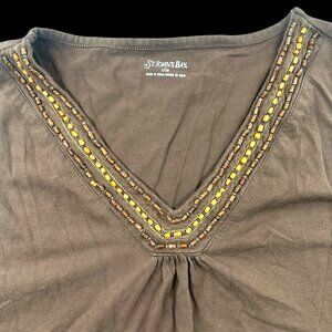 The St. Johns Bay Beaded Tank Top features a sophisticated gathered detail and a flattering V-neckline, enhancing its elegant silhouette. Crafted in a warm brown hue, this top includes small side slits for added comfort and ease of movement. Its refined beaded accents provide subtle texture, making it a versatile piece suitable for both casual and dressier occasions. Ideal for those seeking a blend of style and comfort in a lightweight, breathable design.
