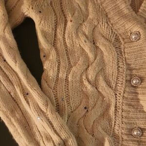 Elegant beige cardigan with intricate cable knit. Features sparkling buttons. Ideal for layering.