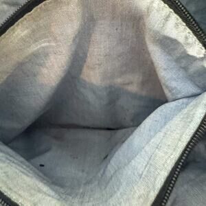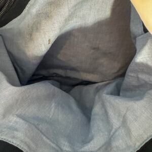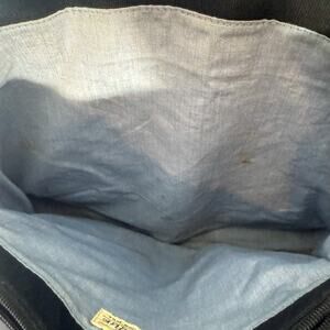 Interior: The spacious interior is lined with a light, washed blue canvas/chambray-like fabric (visible stain/wear in photos). The original woven "AUTHENTIC ST. JOHN'S BAY ESTABLISHED 1984" tag is intact.