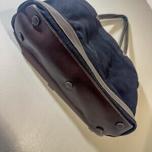 Structured Base: The base is entirely dark brown leather/faux leather and features four protective metal feet (studs), which help keep the bag upright and protect the material.