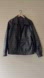Classic black leather jacket with a zip front, two side pockets, and adjustable snap cuffs. Genuine leather shell with full polyester lining. Slight wear and scuffing at the bottom hem (pictured), but still lots of life left.