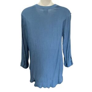 Tunic Blouse Top Button Down V-neck by St John’s Bay in Blue Crinkle Fabric Front Pleated Seams 3/4 Length Button Cuff Sleeves Women Size Medium