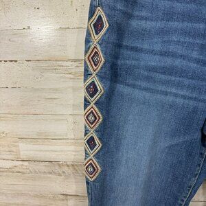 Embroidery down the side of the legs with colors of Red, Blue, Cream and Tan Diamond Shapes