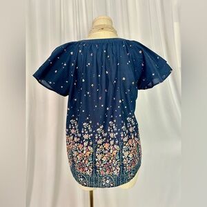 This stylish blouse features a calming blue color with a vibrant floral design in coral, pink, and white. The short sleeves are adorned with a charming ruffled detail, complementing the relaxed V-neckline for a breezy and casual look.