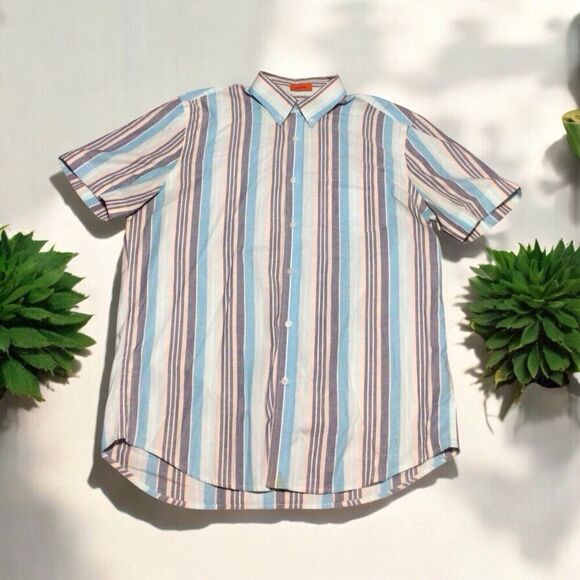 Dress up or dress down with the St. John's Bay Comfort Flex Men's Large Easy Care Short Sleeve Button-Down Shirt. Featuring a classic striped pattern in a multicolor palette, this shirt offers a versatile addition to any wardrobe. The cotton blend fabric ensures breathability and ease of care, making it a practical choice for both busy professionals and laid-back vacationers.