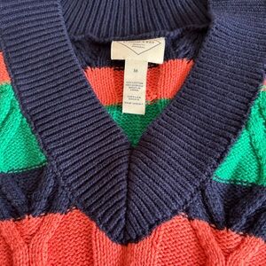 Make this colorful cable knit sweater in yellow, blue, green & pink stripes a key piece of your cold weather wardrobe. Featuring a fitted silhouette and ribbed knit trims for a flattering look. Pairs well over solid slim fit tees and turtlenecks for extra warmth.