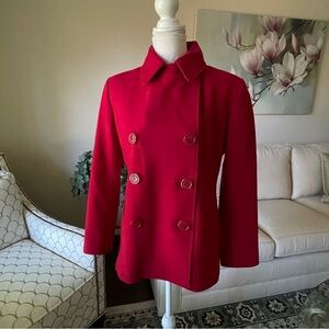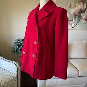 St. John’s Bay cranberry double breasted pea coat. Beautiful sophisticated 100% wool jacket coat. Notch collar, two pocket, fully lined. Approximate measurements laying flat: the chest is 20.5” and the length is 27”. Red leather gloves size M with Thinsulate lining. Stay warm and toasty as the weather turns cold in this attractive pea coat and matching gloves. Excellent condition. Size M