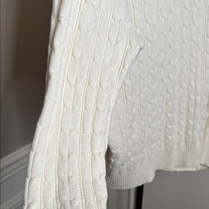 This cream sweater features a classic cable knit pattern, offering a textured and dimensional look. With its relaxed fit and crew neckline, it provides both comfort and style. The long sleeves add to its cozy appeal, making it a perfect choice for cooler days.