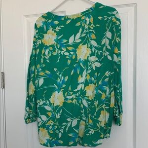 Elegant green blouse with a vibrant floral pattern by St. John’s Bay. Perfect for adding a pop of color to your wardrobe. Excellent condition. No rips are stains. 3/4 inches elastic sleeves. Armpit to armpit is approx 23 inches. (See photos)