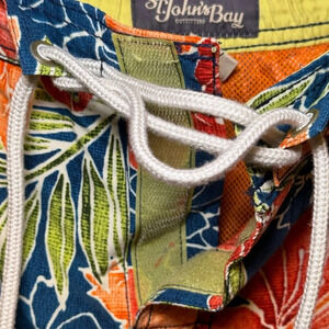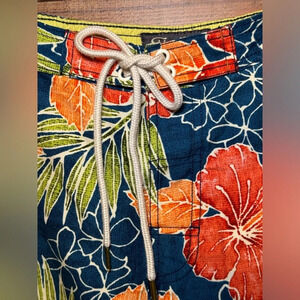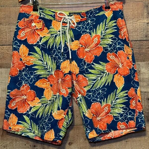 Pre-loved condition. St.John's Bay Outfitters swim trunks/ board shorts in a men's size medium. has velcro and tie closure. Has two side pockets, one small front button close pocket and one back velcro close pocket. Hawaiian, hibiscus tropical floral print. Mesh brief liner.