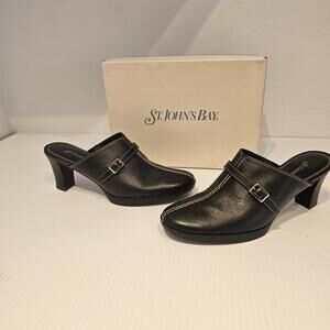 St. John's Bay Leather Slip On Mules Black 3" Women's Size 7. Pre-owned condition, please review all pictures for more details.