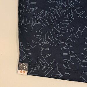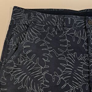 St John's Bay Men's 40x9 Comfort Stretch Flat Front Shorts New With Tag. Zipper fly with button closure. Front side slit pockets. Back pockets with button closures. Dark blue with gray tropical leaf pattern. 98% cotton, 2% spandex. Shorts are in excellent new with tag condition. Please see photos for details and measurements.
