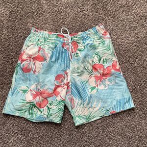 St. Johns Bay mens blue, green, orange, tan Hawaiian floral pull on swim trunks, board shorts with a pull string closure. Elastic waist band and two side pocket, also has an attached mesh liner. Size medium. In excellent pre-owned condition.
