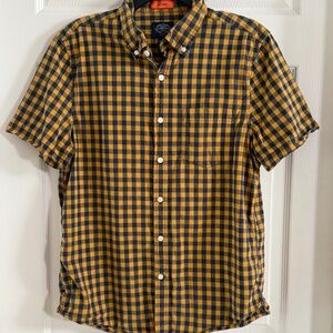 Men's gold and blue checkered button up. Short sleeves with breast pocket. No tuck comfort flex. In very good condition. Material is cotton/spandex mix. Marked size M.