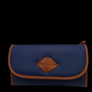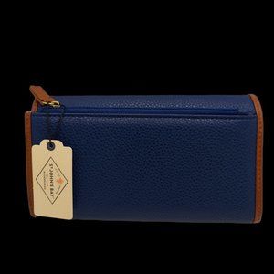 St. John's Bay wallet - NWT. Features 15 card slots, ID window, zippered back pocket, and a snap closure. Classic looking wallet in a soft pebbled man-made material navy blue with brown edging.