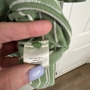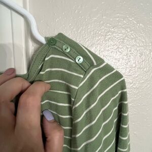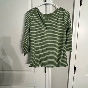 Chic olive top with white stripes. Features comfortable 3/4 sleeves.