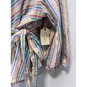 This St. John's Bay Pastel Striped Cotton Long Sleeve Wrap V Neck blouse in women's size 2X is a stylish and versatile addition to any wardrobe. Made from 100% breathable cotton, it features a V-neck and drawstring closure for a comfortable fit. The pleated accents and multicolor stripes add a touch of charm, making it suitable for both casual and formal occasions. With its collarless design, balloon sleeves, and outdoor theme, this blouse is perfect for the summer and spring seasons. Easy to care for with machine washable instructions, this blouse is a must-have for any fashion-forward woman.