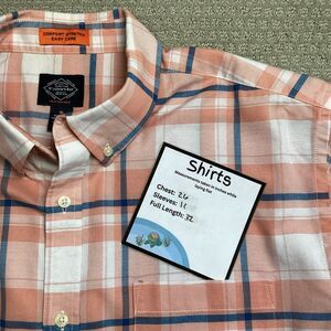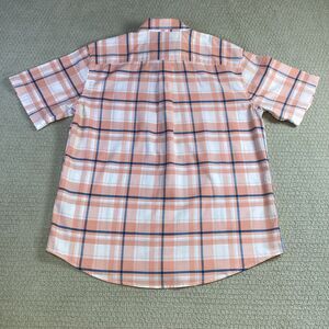 Men’s St. John’s Bay short sleeve button-up shirt in a peach, navy, and white plaid. Size XL. Features a chest pocket, comfort stretch, and easy care fabric. Made of 60% cotton / 40% polyester. Excellent casual look for warm weather. Measurements: Chest 24", Sleeves 11", Full Length 32".