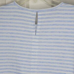 St. John's Bay Petite Medium Blue White Striped Side Pockets Stretch Knee Length Dress with Round Hem Hi Lo Hem and Back Keyhole. Short Sleeves, Back Slit