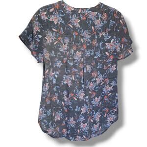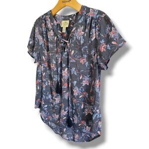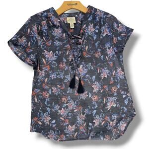 St. John’s Bay blouse featuring a navy floral print with lace-up neckline and tassel tie detail. Made with a lightweight rayon polyester blend for comfort and style. Gently used and in great condition — perfect for casual wear or layering.