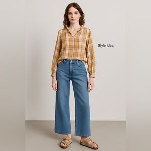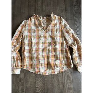 Cozy, casual, and effortlessly charming, this early 2000's St. John’s Bay plaid blouse is perfect for layering in any season. Made from 100% breathable cotton, it features a ruffle-trim split neckline, long sleeves with button cuffs, and a relaxed fit. The warm beige, mustard, red, and teal plaid pattern adds a rustic, vintage-inspired/cottagecore touch.