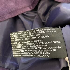 This suede jacket has a classic, slightly oversized fit that works well as a fall or winter outer layer. The deep purple color makes it stand out while still being versatile for casual or dressy looks.