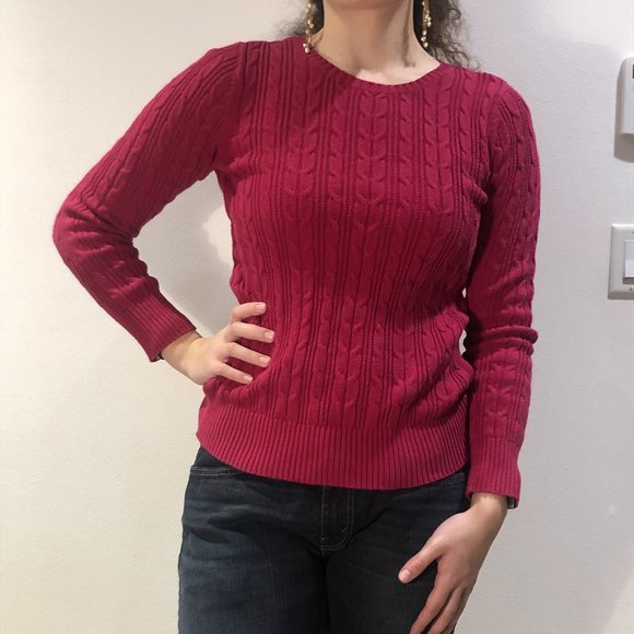 Raspberry red knit sweater from St Johns Bay. Good condition, size small. 88% cotton, 12% nylon. Fitted but stretchy.