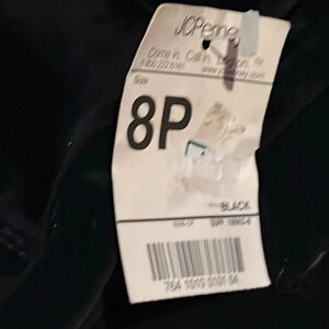 This is a vintage St. John's Bay knee-length black velour pencil skirt in size 8P for women. It features a solid pattern, zip closure, and has five pockets. Made from a cotton and spandex, it does have a bit of stretch. Measurements in photos!