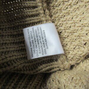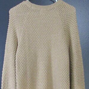 Size large St. John's Bay women's classic crewneck pullover sweater with a textured knit pattern, fisherman stitch, in a light brown/gold color with subtle glitter or metallic accents in the knit material. Long sleeves with ribbed cuffs. Wear with jeans, leggings, skirt, looks great with everything.