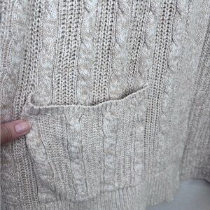 Cozy tan and white cardigan with cable knit texture. Open front design with practical pockets. Perfect for layering and adding a touch of chic elegance to any casual outfit. Stay warm and cozy this fall. Features dropped shoulders. Previously worn.