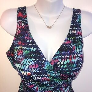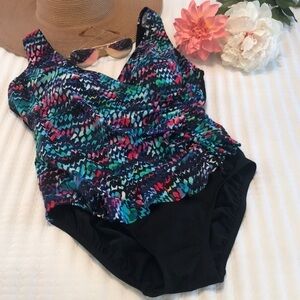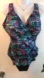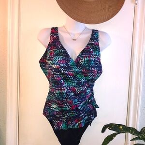 St John’s Bay one piece swimsuit, beautiful multi colors with solid black back, v-neckline with wrap bodice and tie, side ruching, adjustable straps, built in lightly padded bra, ruffled at bottom of print, full coverage, 80% nylon and 20% spandex, in excellent preowned condition, no flaws. Item has been freshly laundered and ready for immediate wear.