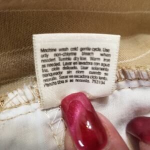 St Johns Bay Women's Beige & White Color Striped Stretch Capri Pants; Size 14; Material - 97% Cotton, 3% Spandex; Care - Machine Wash Cold, Tumble Dry Low; Made in Bahrain; Belt Loops, Zipper, 2 Buttons on Tab Waist Band, Inside Button Missing,
