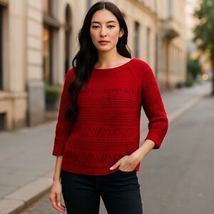 The St. John's Bay Women's Ladybug Red Cable-Knit Sweater in size XL is a stylish and comfortable addition to any woman's wardrobe. Made from a cozy cotton blend fabric with a cable-knit design, this sweater features a classic 3/4 sleeve length and a pullover style for easy wear. The vibrant red color adds a pop of color to any outfit, and the machine washable garment care makes it convenient for everyday wear. This sweater is a versatile piece that can be dressed up or down for various occasions.