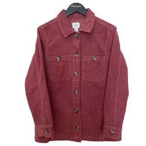 St. John’s Bay women’s corduroy shirt jacket in a rich Apple Butter color. Features a soft midweight corduroy texture, full button front, long sleeves, and two chest pockets. Perfect for layering in fall and winter, combining warmth with classic casual style. Pre-owned in good condition with minimal signs of wear.