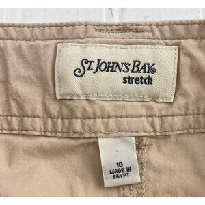 These St John's Bay khaki cargo capri pants are perfect for casual outings. Designed for comfort and style, they feature multiple pockets for convenience and are made for women's size 10. Ideal for pairing with your favorite top for a relaxed look.