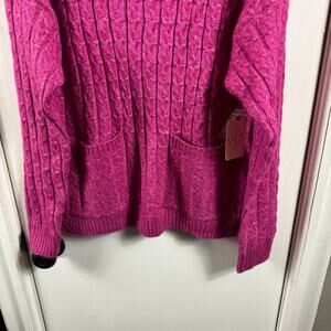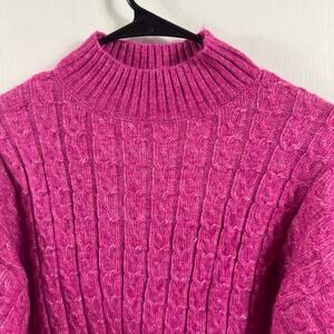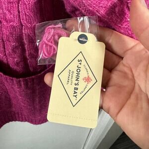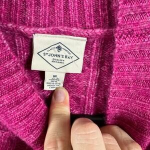 St John’s Bay acrylic soft pink mock neck sweater with pockets. 65% acrylic 35% polyester. Size medium. Pretty pink color and cozy material.