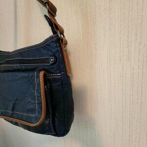 St John's Bay cross body shoulder purse. EUC, faux leather, very soft material, dark blue with tan accents and strap. Strap is extendable much longer than itis in the pictures, so it can be a shoulder bag or cross body bag. clean, no tears or stains. Smoke-free home.