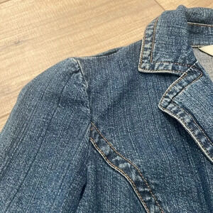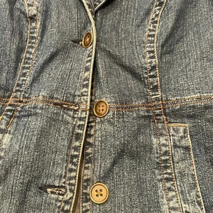 Preowned very nice condition St Johns Bay petite small denim (with light stretch) fitted jacket. 98% cotton 2% spandex. No signs of damage.