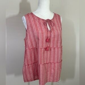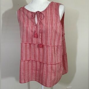 A very cute top in a boho style. Woven fabric with a stripe look. Tassels tie at the neck. Newer style Works great as a coverup and a tunic like style with shorts. Measurements are pit to pit flatfold about 211/2” The length to hem measures about 26”. No visible flaws. Any questions please ask and we will answer questions ASAP. M