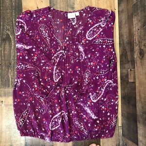 St. John’s Bay Blouse Semi Sheer Purple Paisley Print Tie Front 3/4 Sleeves XL