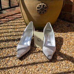Gorgeous St. John dress shoes, made in Italy, light silver-blue satin-leather with a 2 inch heel. The crystals in clear white rhinestone spread across the toes in tiny rectangles. Worn once for a gala. Tiny wear on sole from this "one-night-out," as shown in photo. Upscale and elegant.