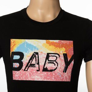 This is a fabulous t-shirt by St. Laurent Paris. The t-shirt has a graphic rectangle block on the chest. Inside the block is the word BABY in an inked looking black surrounded by plumes of color in pink, blue, red and yellow.