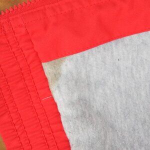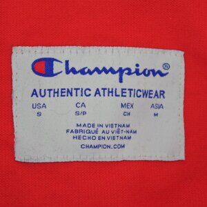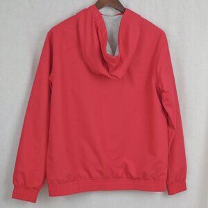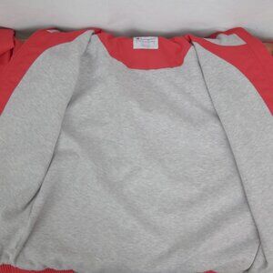 This listing is for a Champion Full Zip Hooded Victory Jacket with a Saint Lawrence University Saints front embroidery. It has a red synthetic shell with front pockets and a heather grey cotton blend lining.