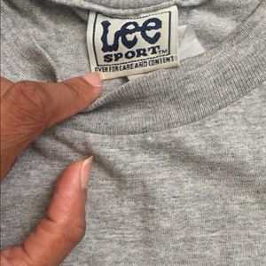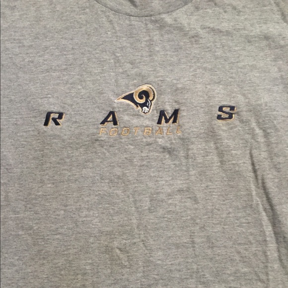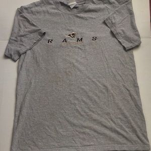 The tee is for the Rams fans! The shirt is decked out in a very cool gray color wave. It has the Rams football name across the chest in gold and the logo the Ram in navy and gold which is all stitched onto the tee. The shirt is by Lee Sports as shown above on the tag. The shirt is in good condition