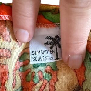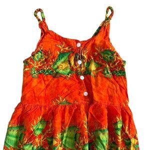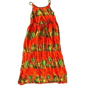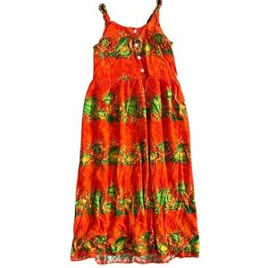 Bright orange with green fish and coral print. Sleeveless with button front, tie-back waist, and stretchy straps. Lightweight and easy for summer or vacation.